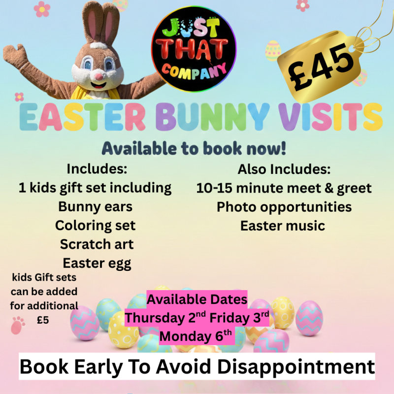 With over 20 years of entertainment experience Just That Company provide children's parties and magic shows, balloon twisting and displays, big bubble displays at events and workshops, circus skills workshops, drama workshops dinosaur meet and greets, Barney Bear and the Easter Bunny character visit and lots more.
